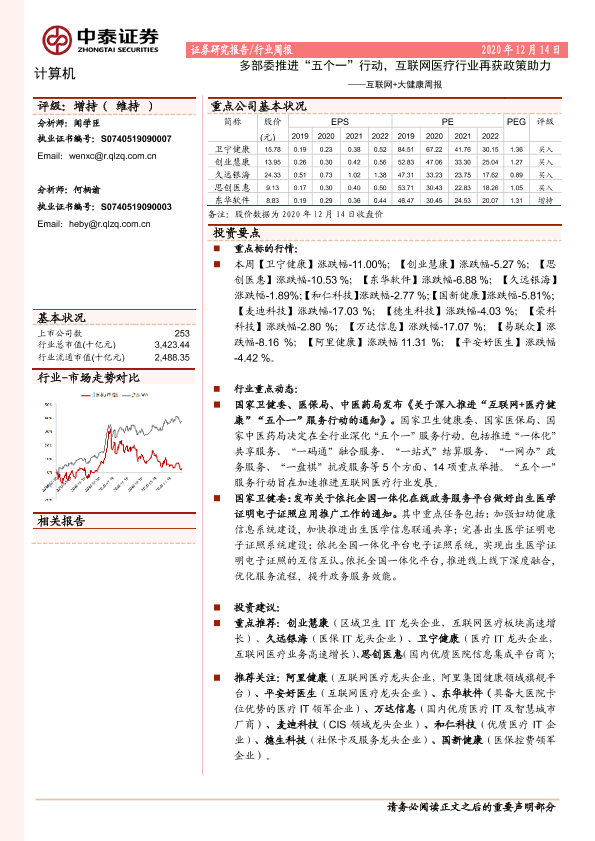 【中泰证券】【20201214】互联网+大健康周报:多部委推进“五个一”行动,互联网医疗行业再获政策助力-9页