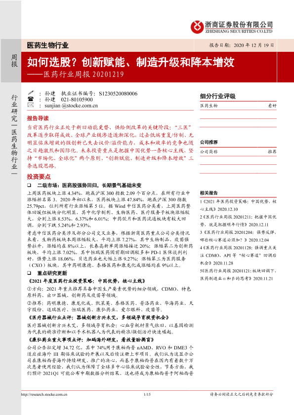 【浙商证券】【20201219】医药行业周报:如何选股?创新赋能、制造升级和降本增效-15页