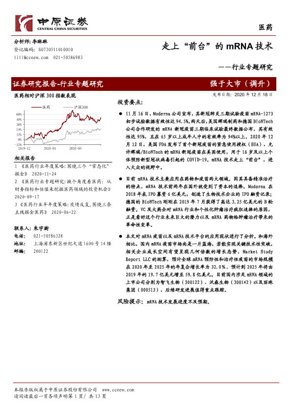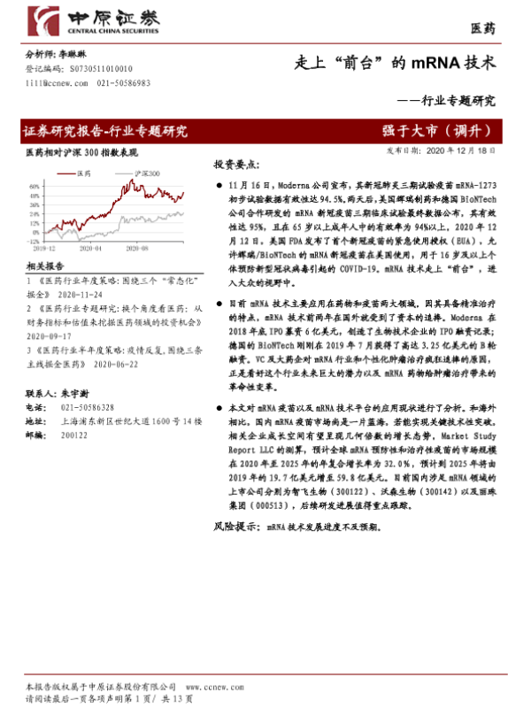 【中原证券】【20201218】医药行业专题研究:走上“前台”的mRNA技术-13页