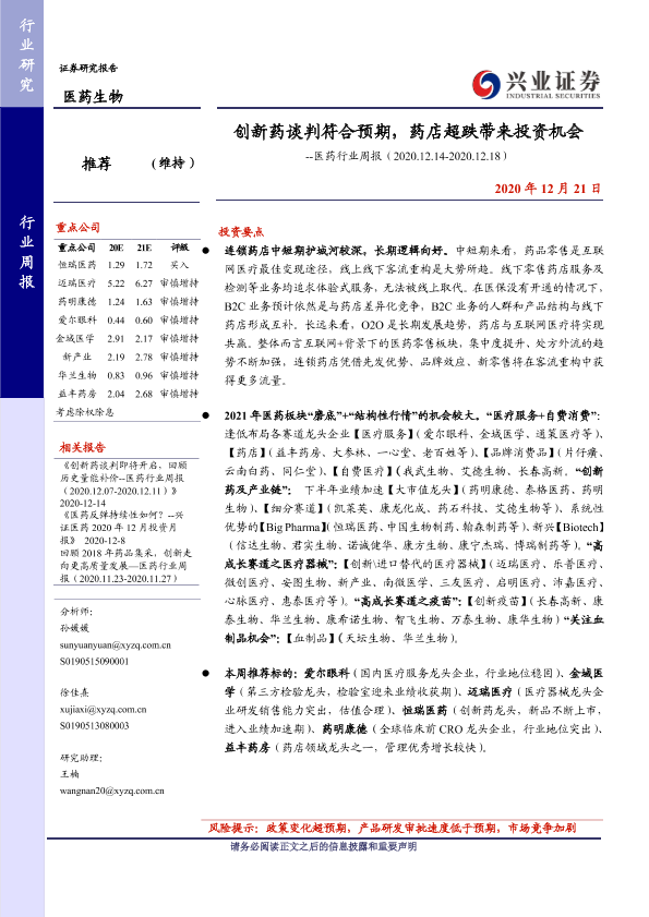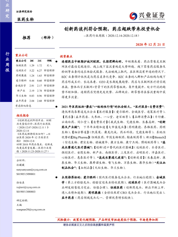 【兴业证券】【20201221】创新药谈判符合预期,药店超跌带来投资机会-15页