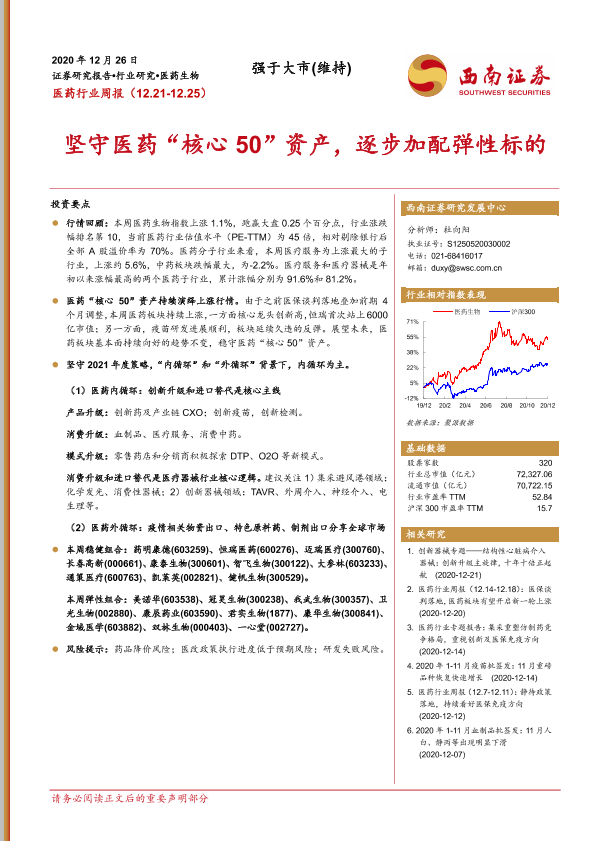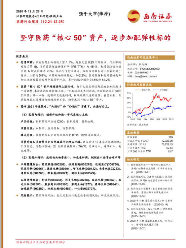 【西南证券】【20201226】医药行业周报:坚守医药“核心50”资产,逐步加配弹性标的-25页