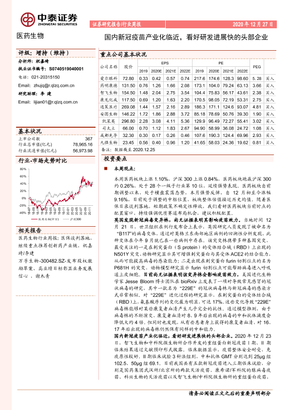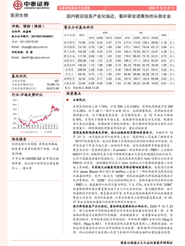【中泰证券】【20201227】国内新冠疫苗产业化临近,看好研发进展快的头部企业-11页