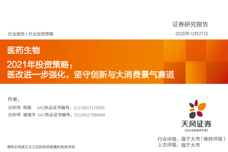 【天风证券】【20201227】医药生物2021年投资策略:医改进一步强化,坚守创新与大消费景气赛道-103页