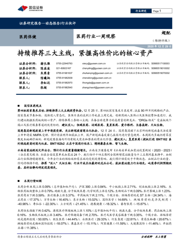 【国信证券】【20201229】医药行业一周观察:持续推荐三大主线,紧握高性价比的核心资产-9页
