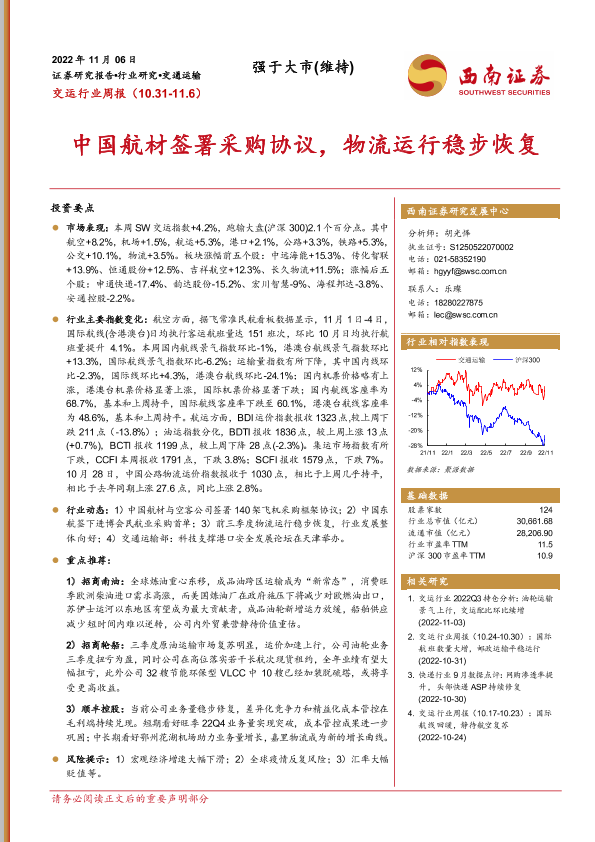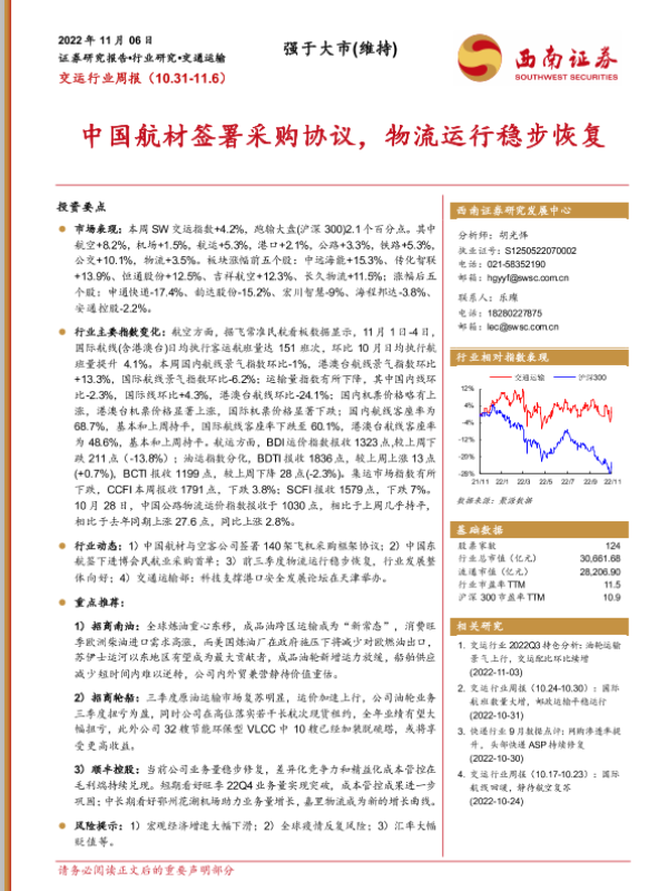 【西南证券】【20221106】交运行业周报:中国航材签署采购协议,物流运行稳步恢复-18页
