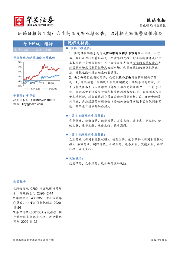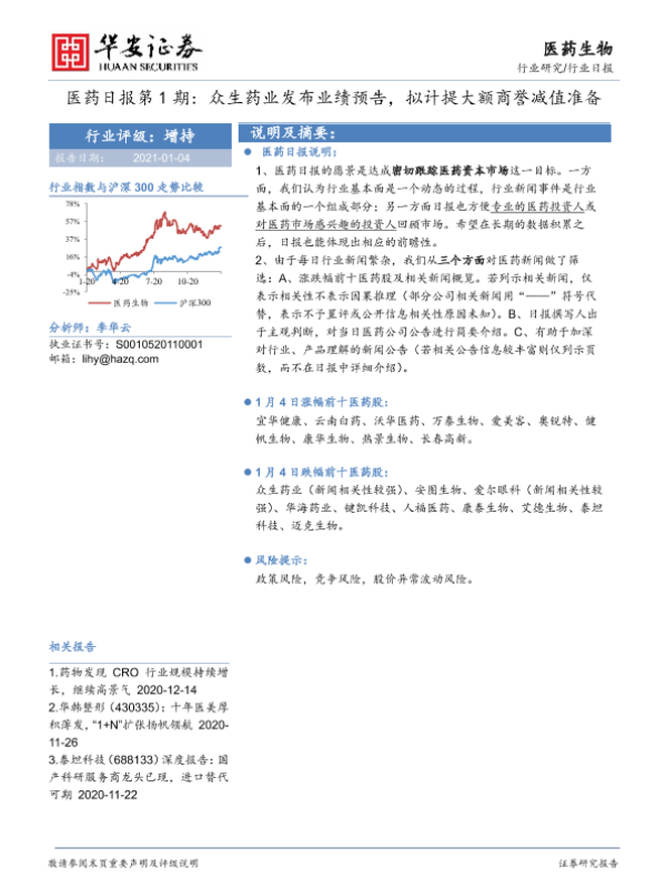 【华安证券】【20210104】医药日报第1期:众生药业发布业绩预告,拟计提大额商誉减值准备-8页