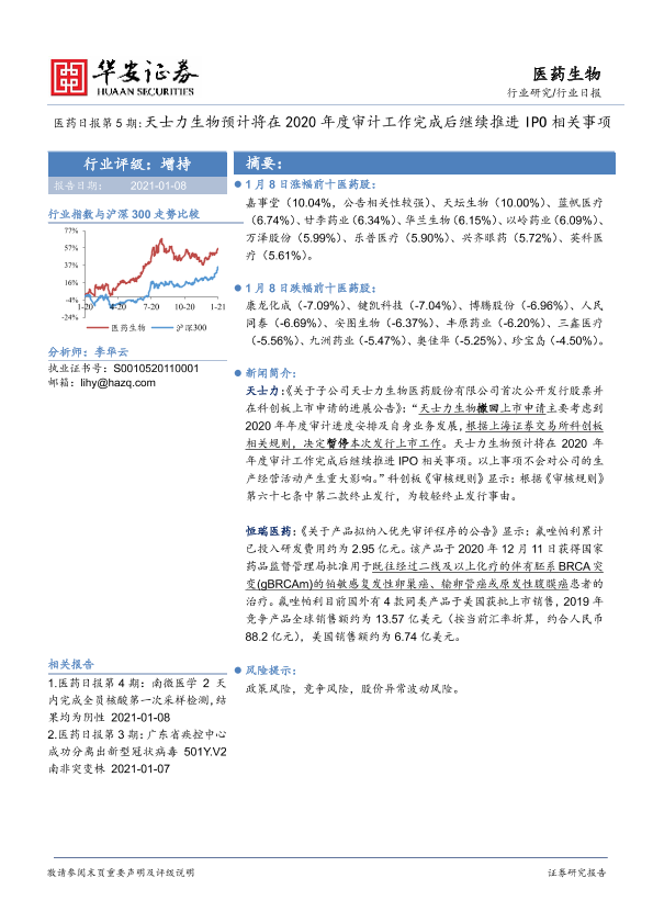 【华安证券】【20210108】医药日报第5期:天士力生物预计将在2020年度审计工作完成后继续推进IPO相关事项-9页