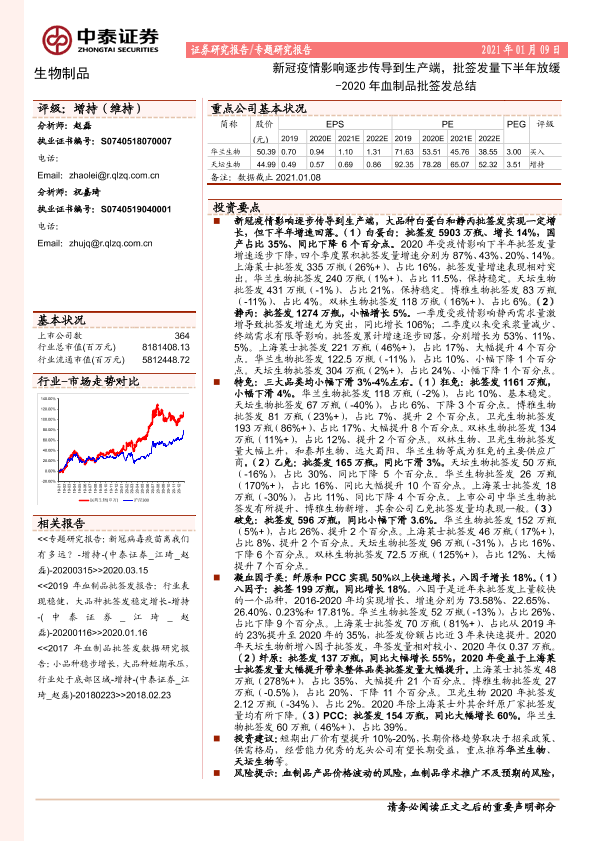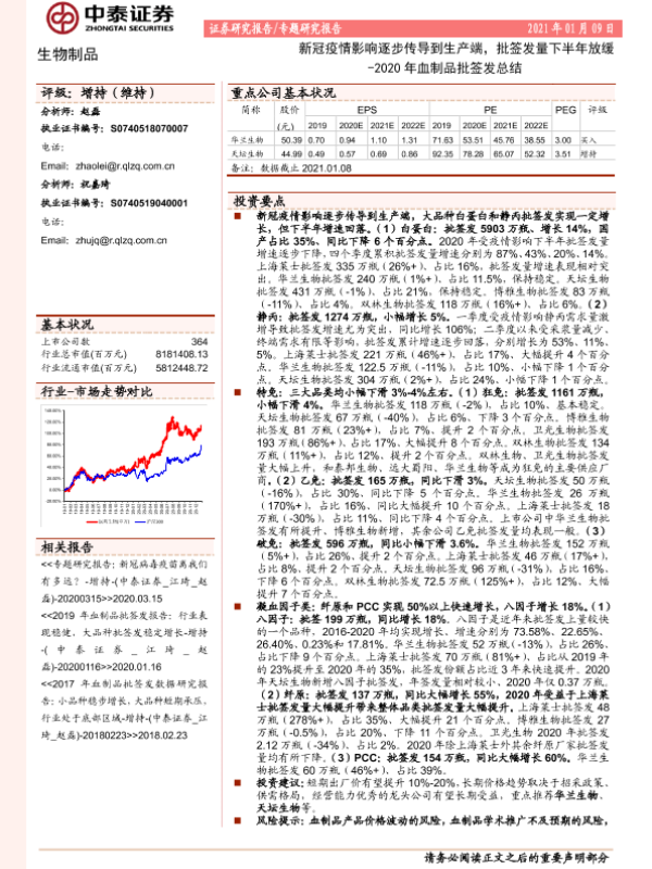 【中泰证券】【20210109】2020年血制品批签发总结:新冠疫情影响逐步传导到生产端,批签发量下半年放缓-12页