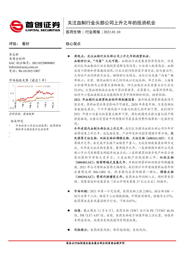 【首创证券】【20210110】关注血制行业头部公司上升之年的投资机会-12页