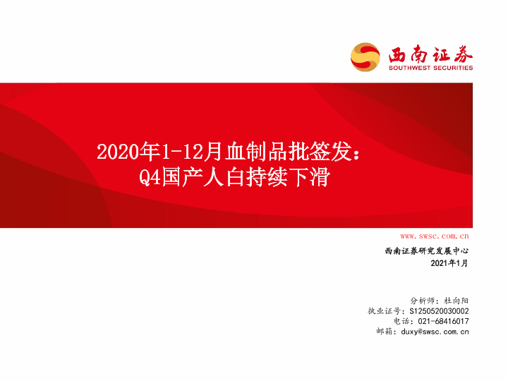 【西南证券】【202101】2020年1-12月血制品批签发:Q4国产人白持续下滑-63页