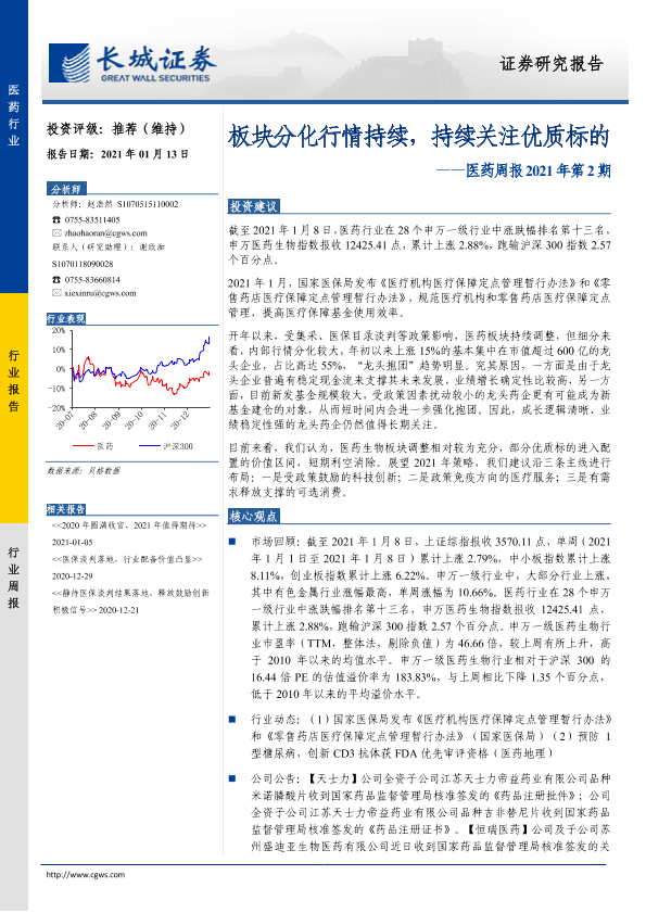 【长城证券】【20210113】医药周报2021年第2期:板块分化行情持续,持续关注优质标的-17页