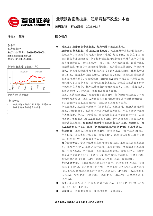 【首创证券】【20210117】医药生物行业周报:业绩预告密集披露,短期调整不改龙头本色-10页