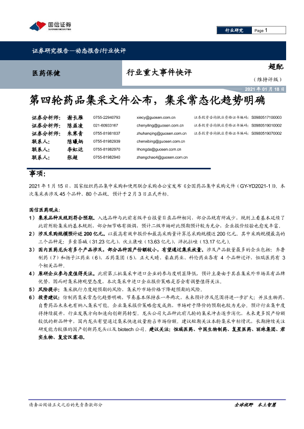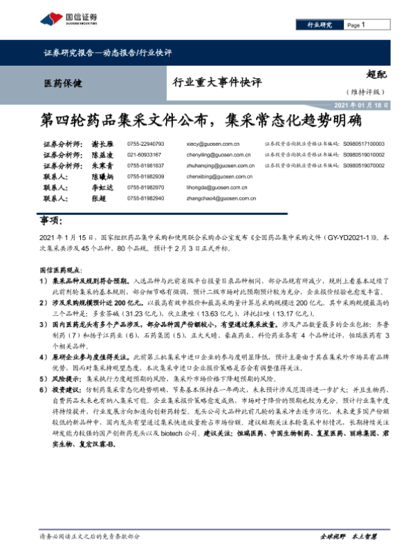 【国信证券】【20210118】医药保健行业重大事件快评:第四轮药品集采文件公布,集采常态化趋势明确-9页