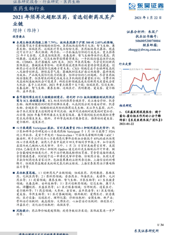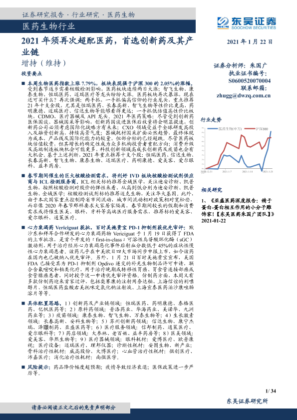 【东吴证券】【20210122】医药生物行业跟踪周报:2021年须再次超配医药,首选创新药及其产业链-34页