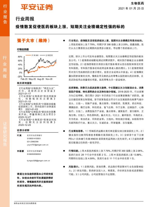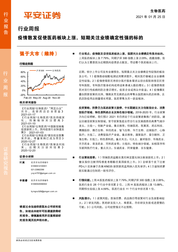 【平安证券】【20210125】生物医药行业周报:疫情散发促使医药板块上涨,短期关注业绩确定性强的标的-6页