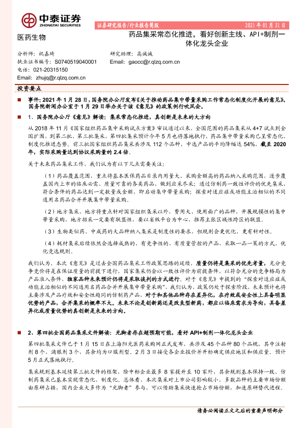 【中泰证券】【20210131】医药生物行业:药品集采常态化推进,看好创新主线、API+制剂一体化龙头企业-3页