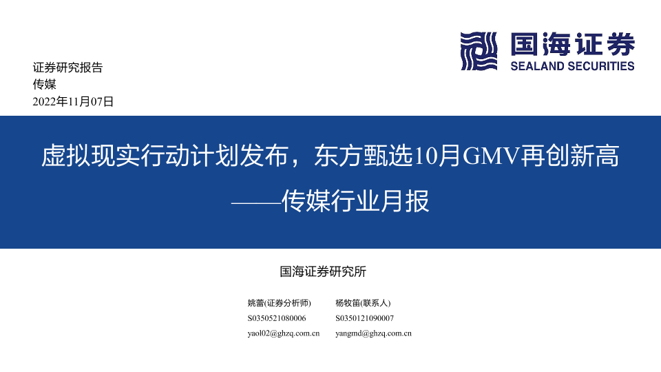【国海证券】【20221107】传媒行业月报:虚拟现实行动计划发布,东方甄选10月GMV再创新高-32页
