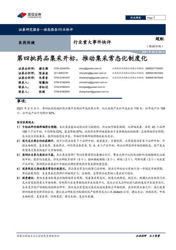 【国信证券】【20210205】医药保健行业重大事件快评:第四批药品集采开标,推动集采常态化制度化-12页