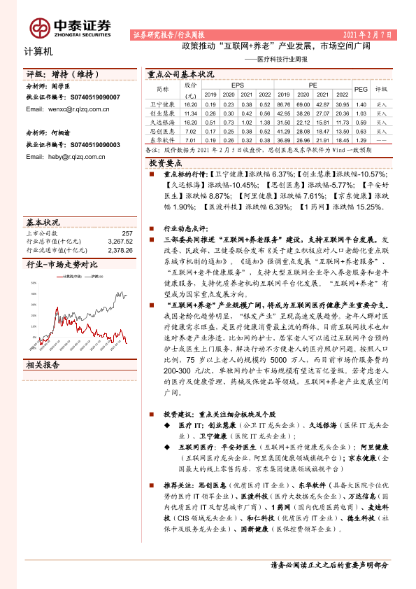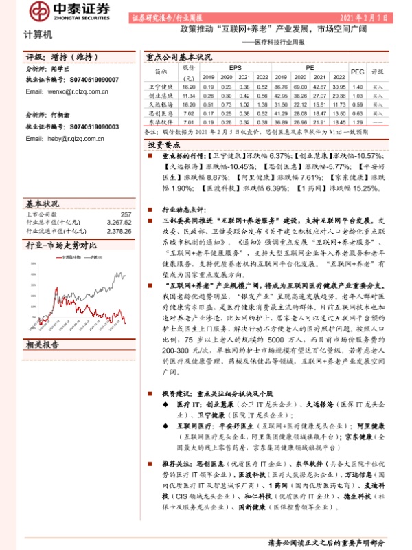 【中泰证券】【20210207】医疗科技行业周报:政策推动“互联网+养老”产业发展-10页