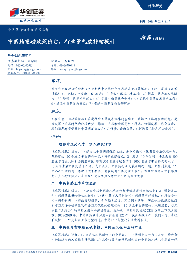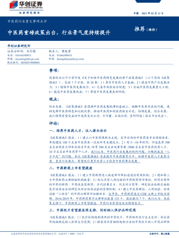 【华创证券】【20210211】中医药行业重大事项点评:中医药重磅政策出台,行业景气度持续提升-6页