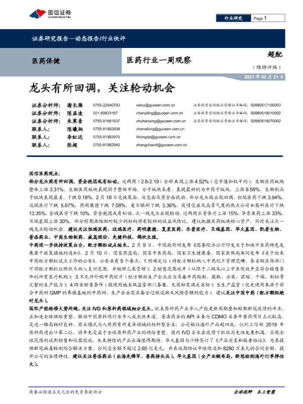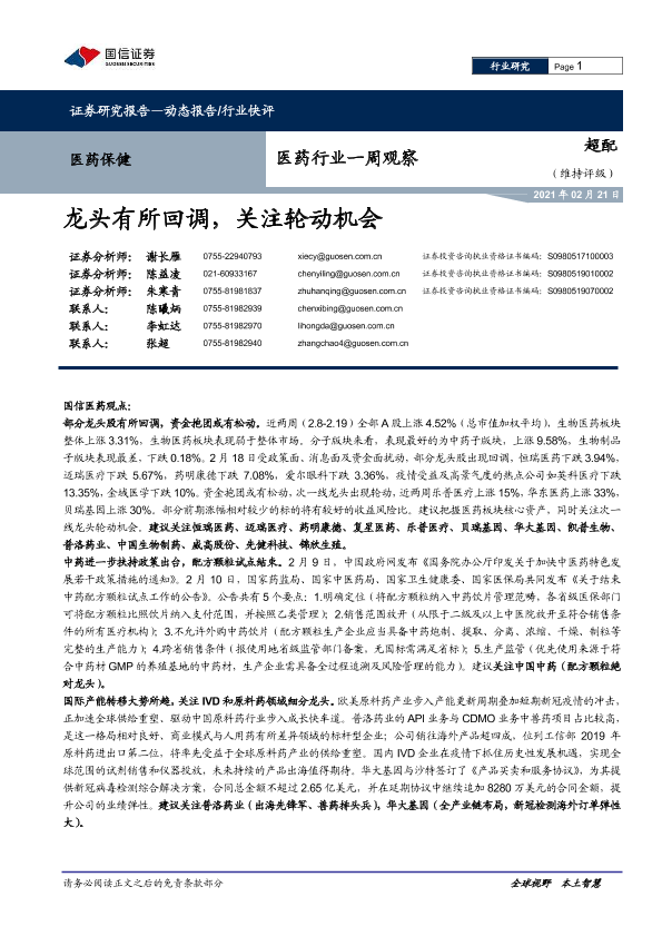 【国信证券】【20210221】医药行业一周观察:龙头有所回调,关注轮动机会-9页