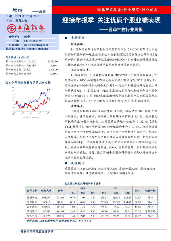 【上海证券】【20210222】医药生物行业周报:迎接年报季 关注优质个股业绩表现-15页