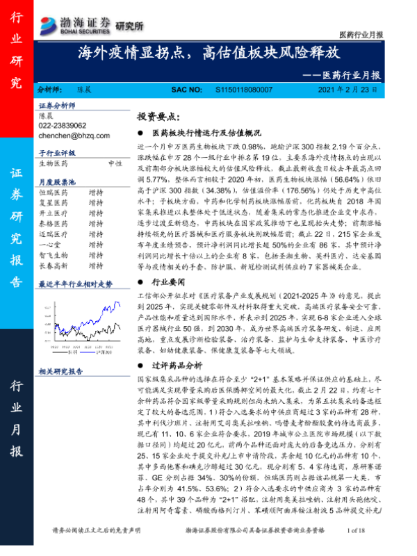 【渤海证券】【20210223】医药行业月报:海外疫情显拐点,高估值板块风险释放-18页