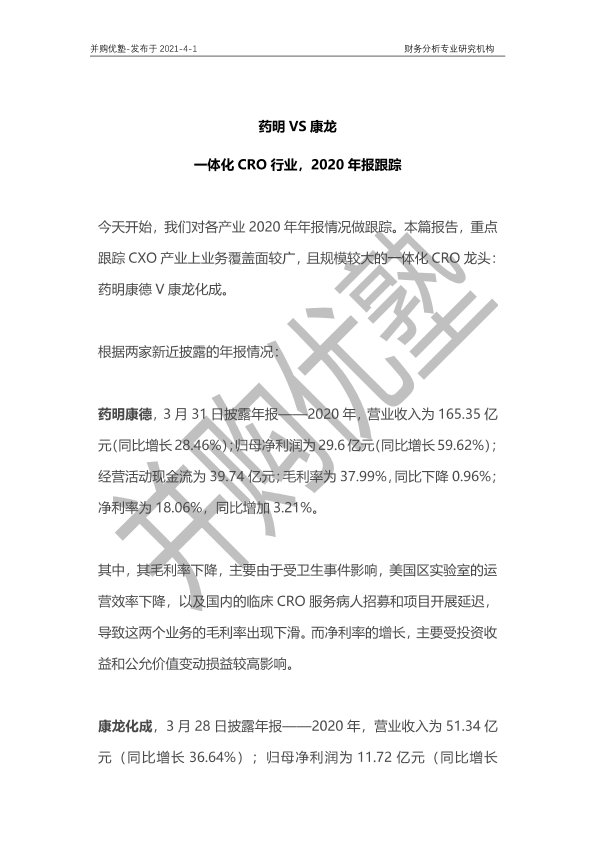 【并购优塾】【20210401】药明VS康龙:一体化CRO行业2020年报跟踪-16页