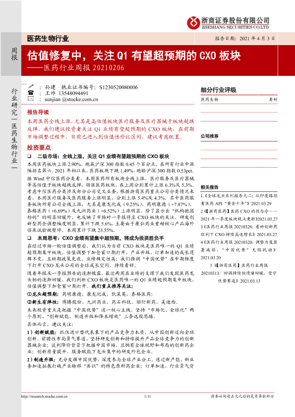 【浙商证券】【20210403】医药行业周报:估值修复中,关注Q1有望超预期的CXO板块-11页