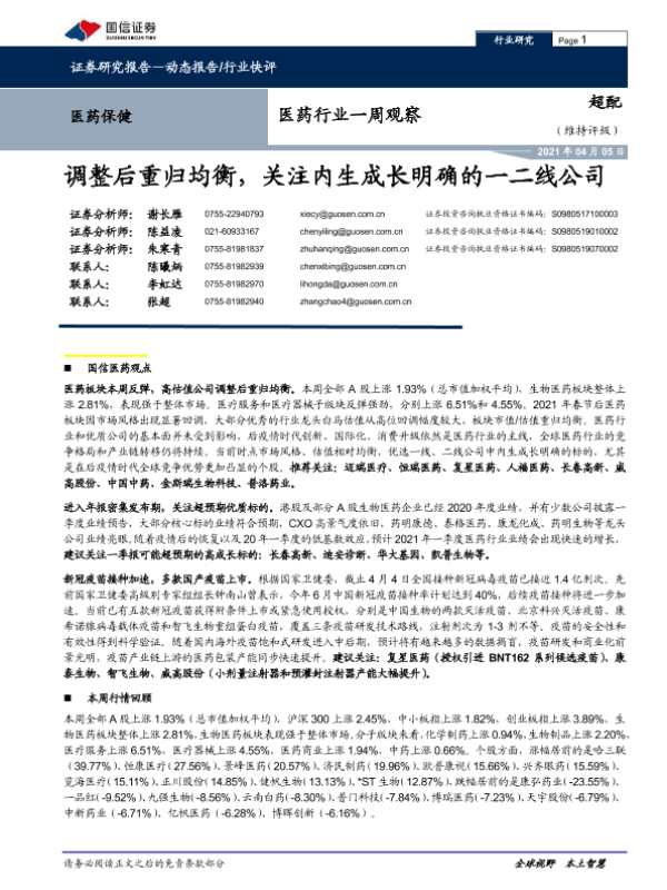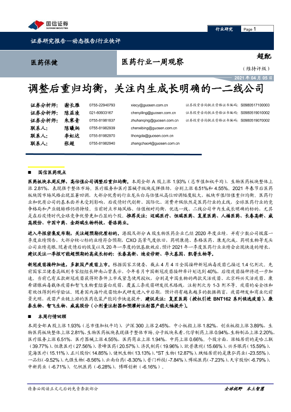 【国信证券】【20210405】医药行业一周观察:调整后重归均衡,关注内生成长明确的一二线公司-14页