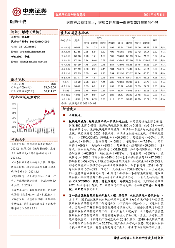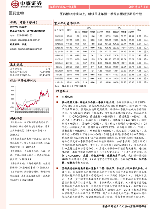 【中泰证券】【20210405】医药生物行业周报:医药板块持续向上,继续关注年报一季报有望超预期的个股-13页