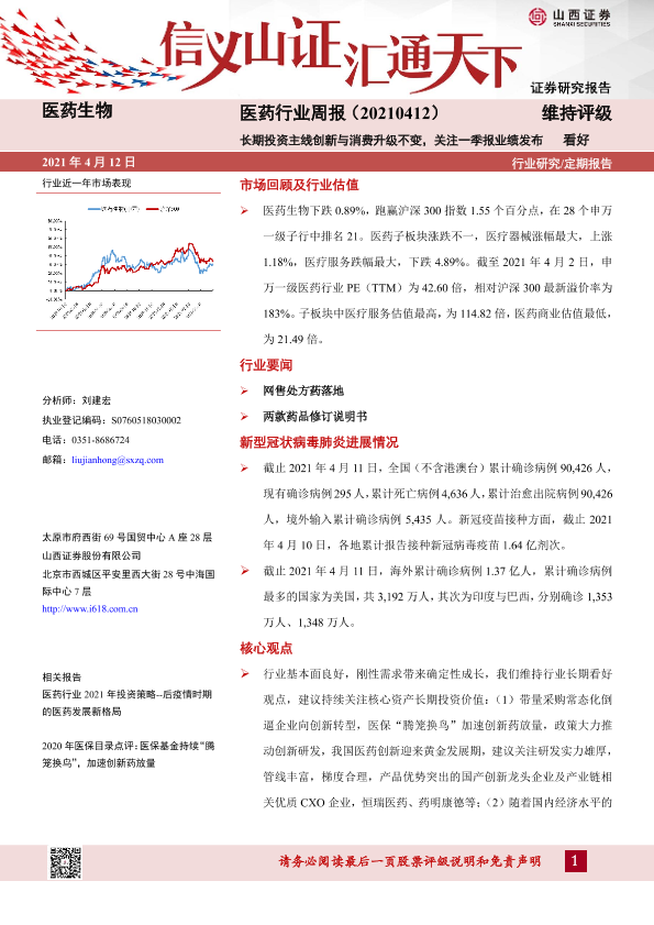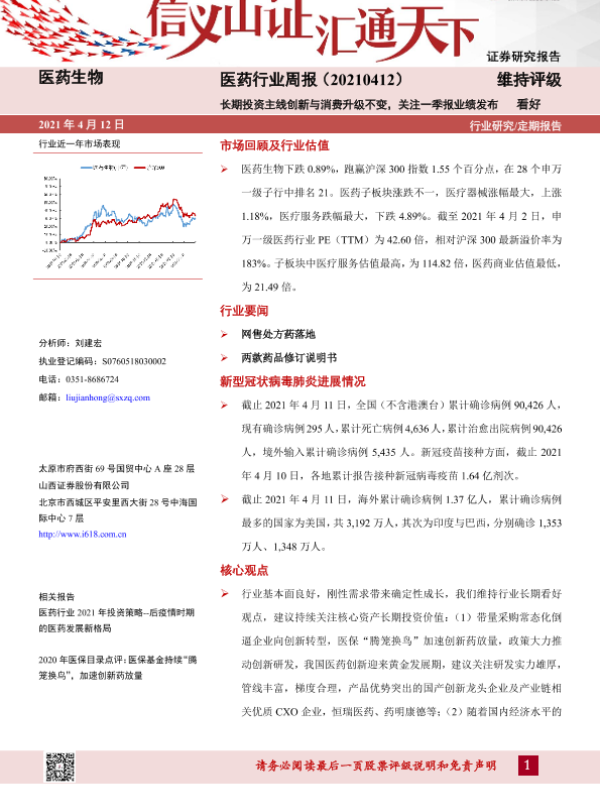 【山西证券】【20210412】医药生物行业周报:长期投资主线创新与消费升级不变,关注一季报业绩发布-8页