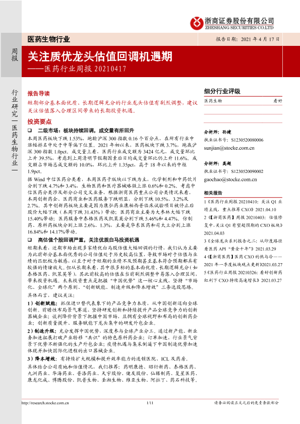 【浙商证券】【20210417】医药行业周报:关注质优龙头估值回调机遇期-11页