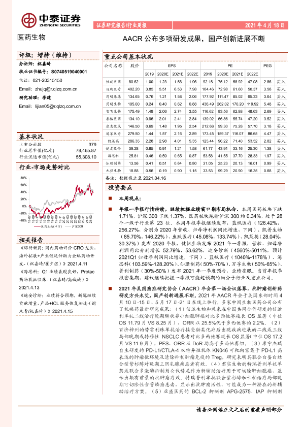 【中泰证券】【20210418】医药生物行业周报:AACR公布多项研发成果,国产创新进展不断-13页