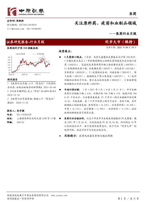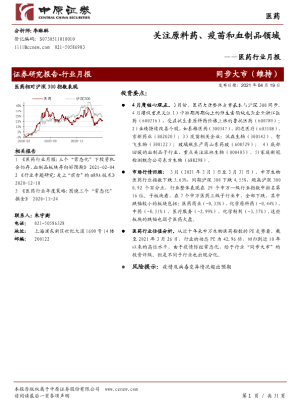 【中原证券】【20210419】医药行业月报:关注原料药、疫苗和血制品领域-31页