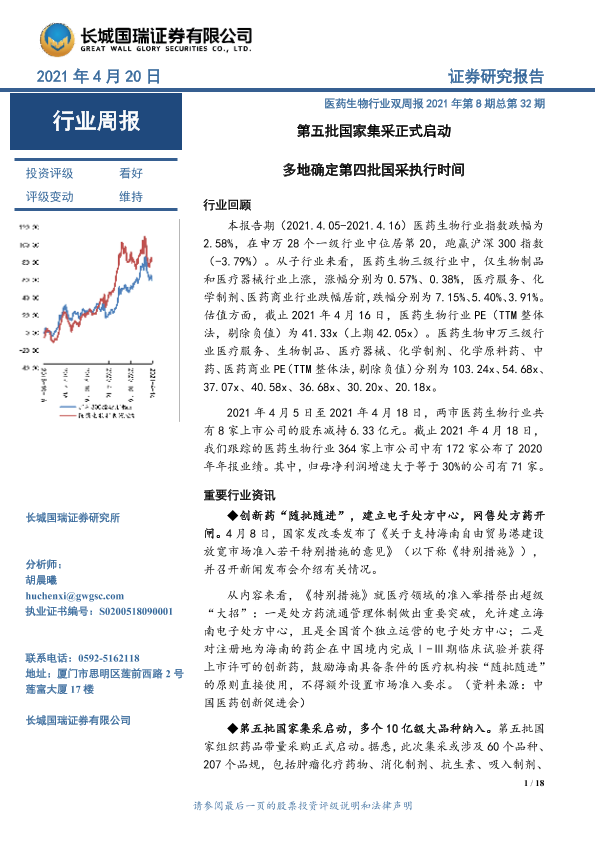 【长城国瑞证券】【20210420】医药生物行业双周报2021年第8期总第32期:第五批国家集采正式启动多地确定第四批国采执行时间-18页