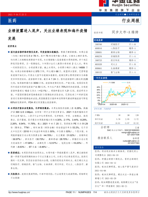 【华金证券】【20210425】医药行业周报:业绩披露进入尾声,关注业绩表现和海外疫情发展-13页