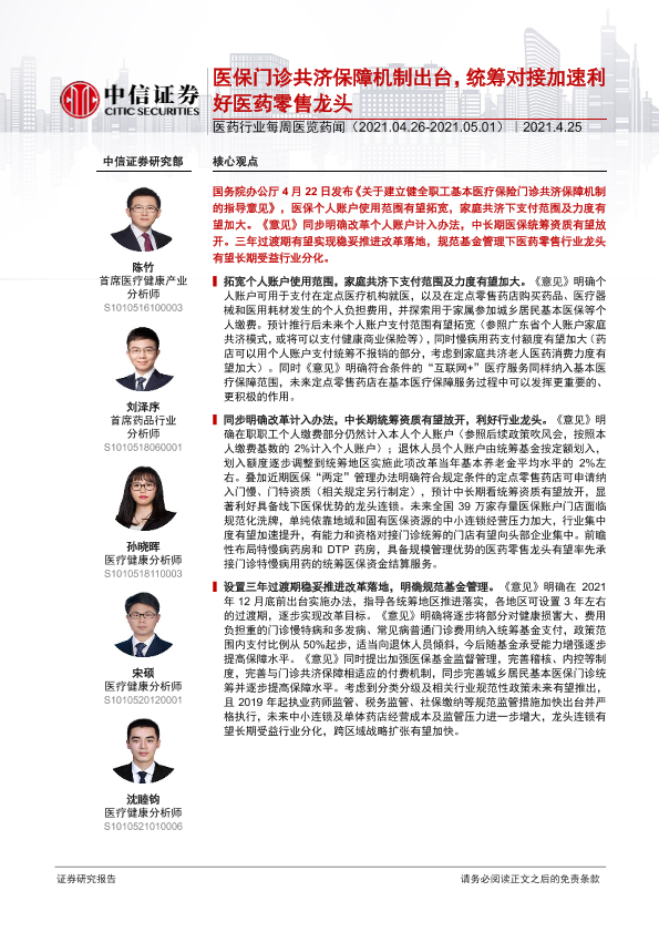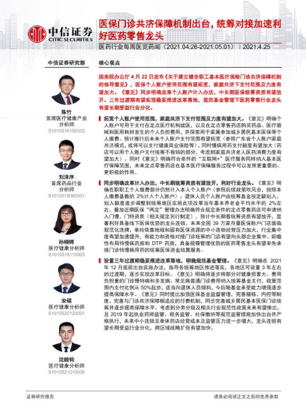 【中信证券】【20210425】医药行业每周医览药闻:医保门诊共济保障机制出台,统筹对接加速利好医药零售龙头-35页
