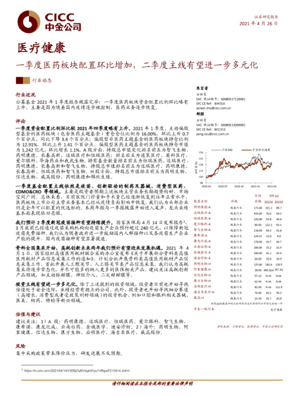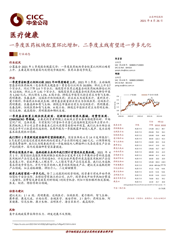 【中金公司】【20210426】医疗健康行业动态:一季度医药板块配置环比增加,二季度主线有望进一步多元化-8页