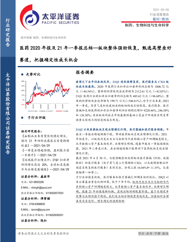 【太平洋证券】【20210505】医药2020年报及21年一季报总结—板块整体强劲恢复,甄选高壁垒好赛道,把握确定性成长机会-36页