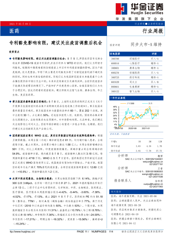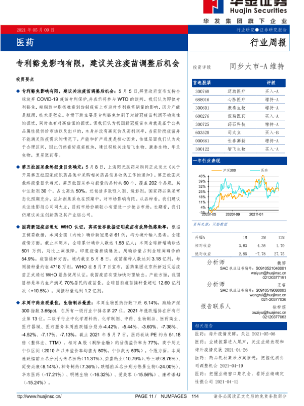 【华金证券】【20210509】医药行业周报:专利豁免影响有限,建议关注疫苗调整后机会-16页