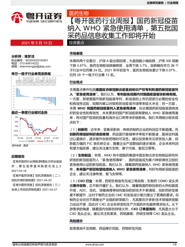 【粤开证券】【20210510】医药行业周报:国药新冠疫苗纳入WHO紧急使用清单,第五批国采药品信息收集工作即将开始-9页