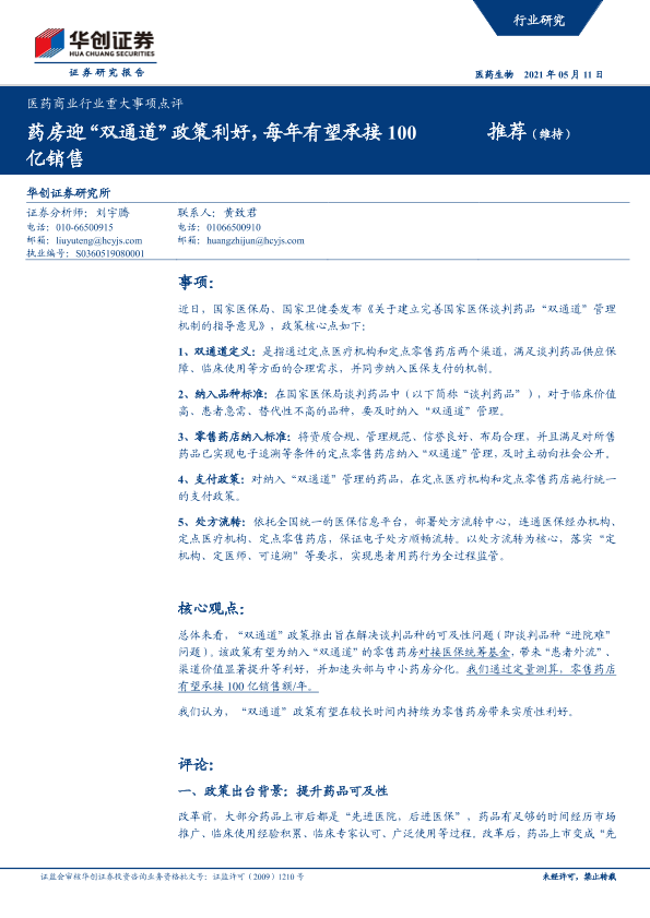 【华创证券】【20210511】医药商业行业重大事项点评:药房迎“双通道”政策利好,每年有望承接100亿销售-6页