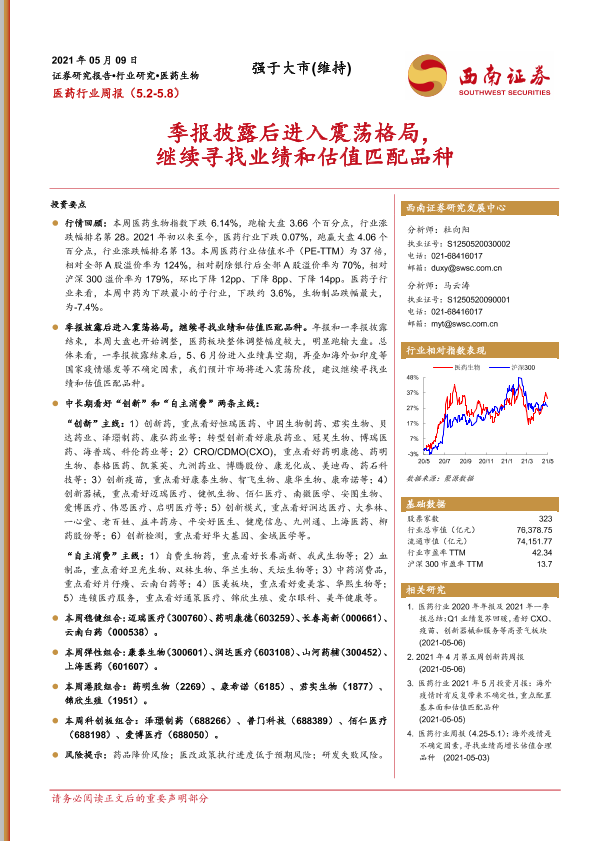 【西南证券】【20210509】医药行业周报:季报披露后进入震荡格局,继续寻找业绩和估值匹配品种-39页
