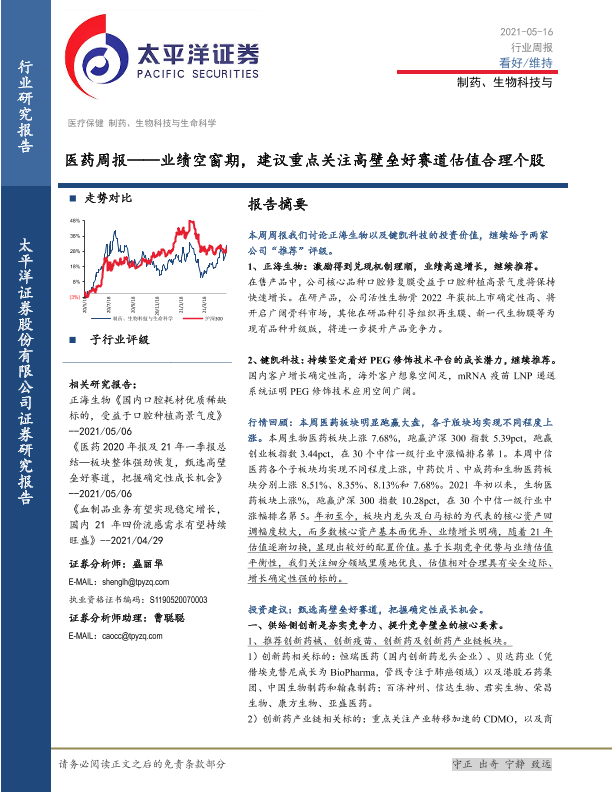 【太平洋证券】【20210516】医药周报:业绩空窗期,建议重点关注高壁垒好赛道估值合理个股-17页