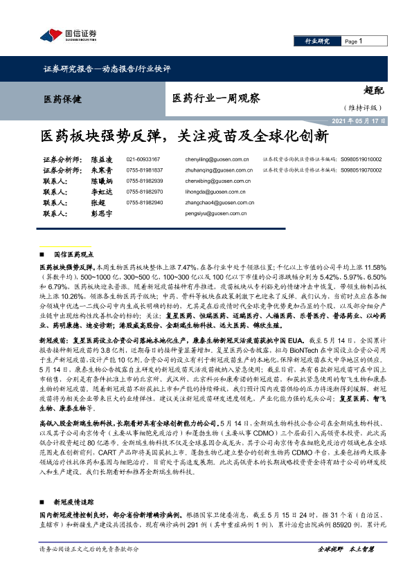 【国信证券】【20210517】医药行业一周观察:医药板块强势反弹,关注疫苗及全球化创新-11页