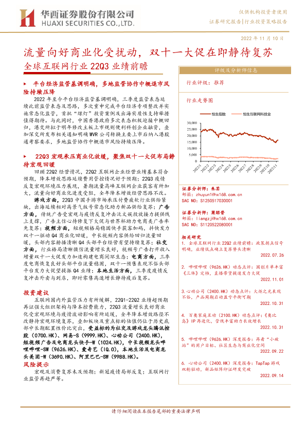 【华西证券】【20221110】全球互联网行业22Q3业绩前瞻:流量向好商业化受扰动,双十一大促在即静待复苏-25页