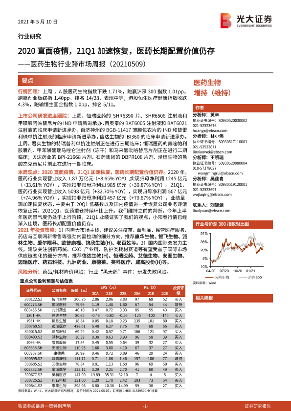 【光大证券】【20210510】医药生物行业跨市场周报:2020直面疫情,21Q1加速恢复,医药长期配置价值仍存-45页