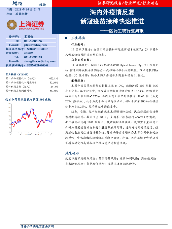 【上海证券】【20210521】医药生物行业周报:海内外疫情反复 新冠疫苗接种快速推进-8页