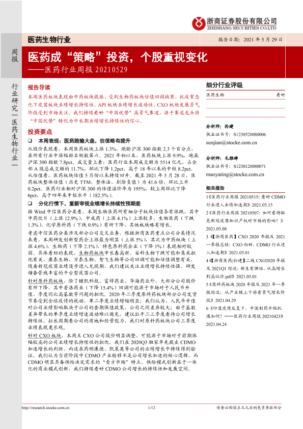 【浙商证券】【20210529】医药行业周报:医药成“策略”投资,个股重视变化-12页